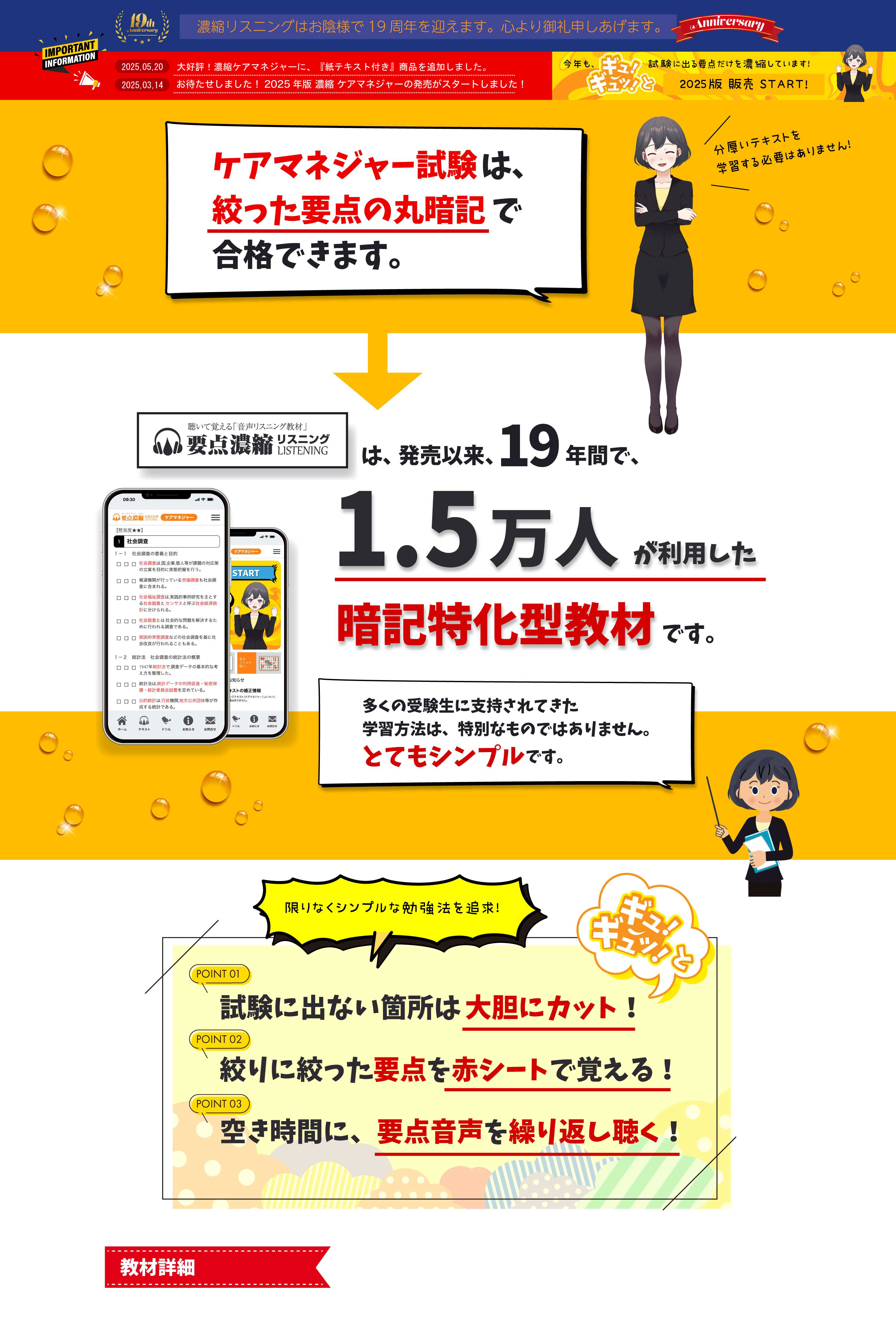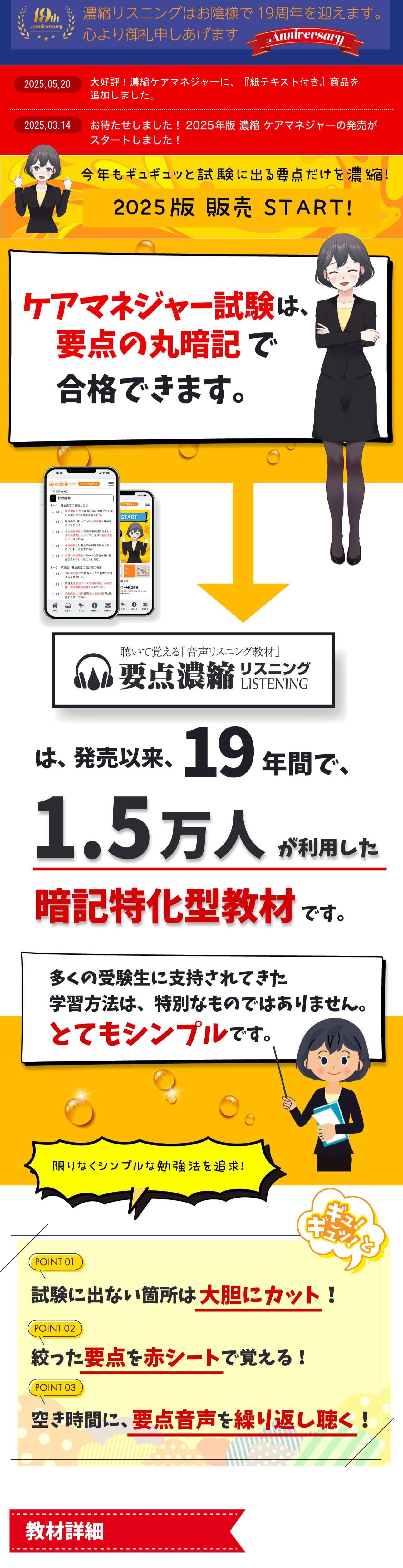家事や仕事に追われる毎日で、なかなか集中して勉強する時間がなく焦っていましたが、要点濃縮リスニングを毎日通勤時間に聴くことで、時間を有効活用することができ合格できました!はじめはCDの内容を理解できませんでしたが、いつの間にか、過去問題や模擬試験をやったときに正解を導き出せるようになりました。知らず知らず、頭に残ってくれたようです。ありがとうございます!